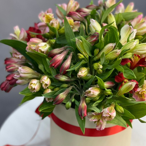 Композиция в шляпной коробке из 21 альстромерии