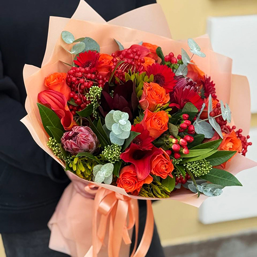 Букет "Красный закат" из калл, роз, калины, скиммии, гиперикума, сафари, гербер и капса