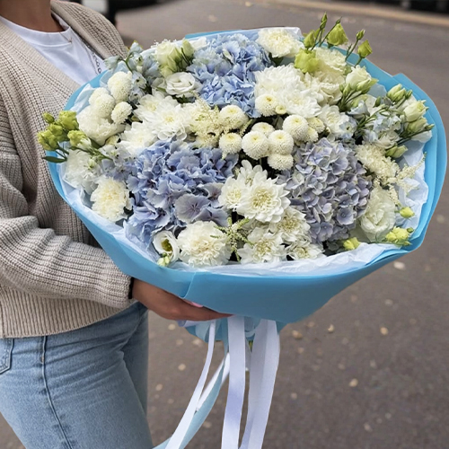 Букет "Голубые облака" из хризантемы, диантусов, Голландской гортензии, дельфиниума и эустомы