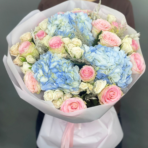 Букет "Легкий ветерок" из роз, конифера и гортензий