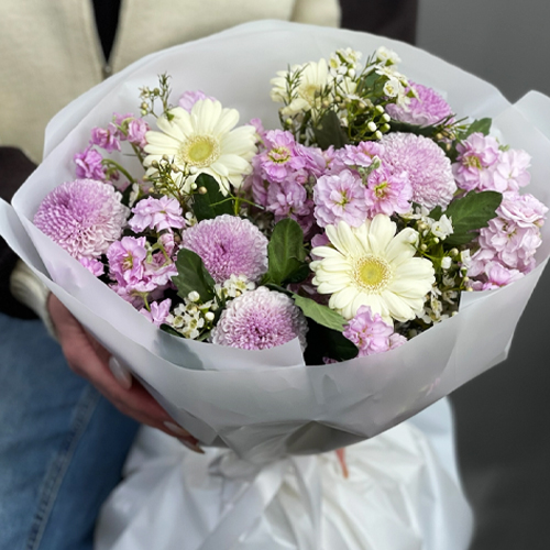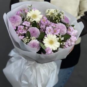 Букет "Мечты сбываются" из хризантем Момоко, ароматных маттиол, хамелациума и гербер