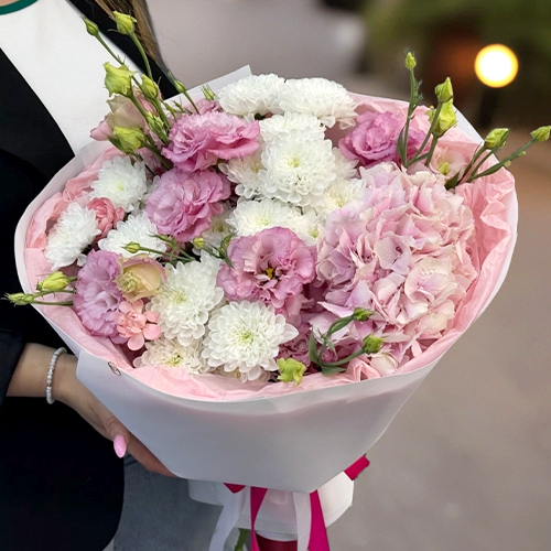 Букет "Табу" из хризантемы, Голландской гортензии и эустомы