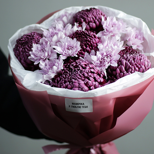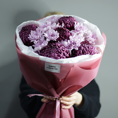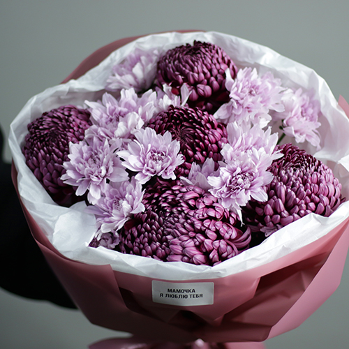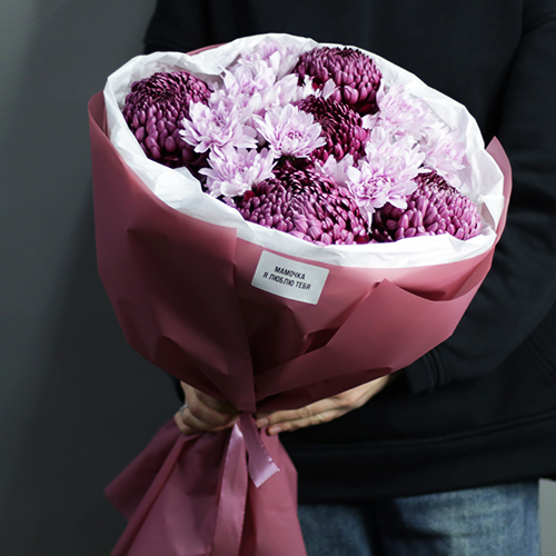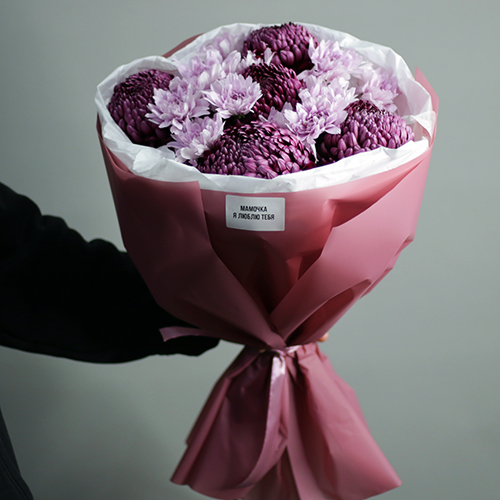 Букет "Мамочка, я люблю тебя" из хризантем Бигоуди и кустовых хризантем