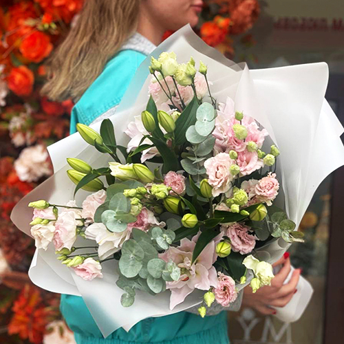 Букет "Моё лето" из ароматных пионовидных лилий и махровых эустом