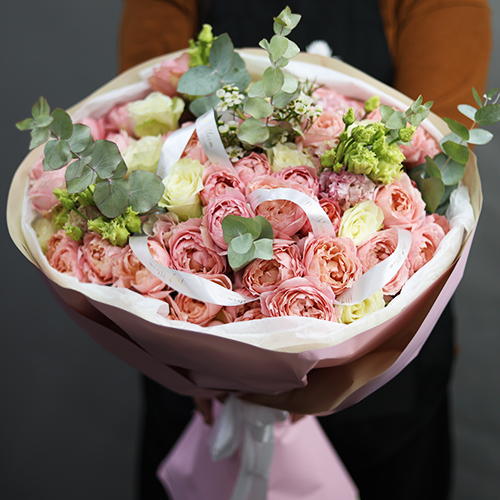 Букет "Миссис" из кустовой розы Джульетта и эустом