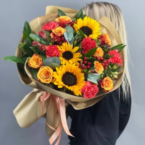 Букет "Ричи" из подсолнухов, альстромерий, гиперикума, роз, скиммии и диантусов