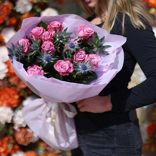 Букет "Базилио" из роз Меритим и веточек эрингиума