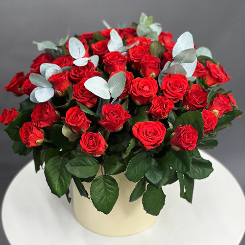 Композиция в шляпной коробке из роз Эль Торо с эвкалиптом