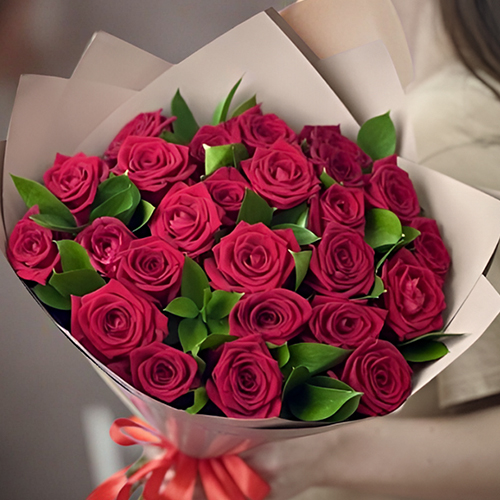 Букет из 25 красных роз и рускуса (50 см)