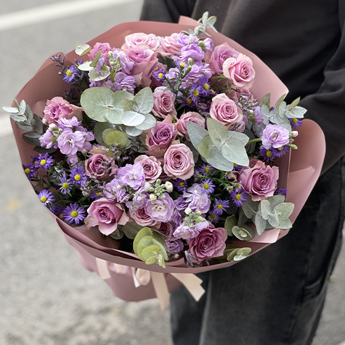 Букет "Хрустальный" из роз, астера и ароматных маттиол