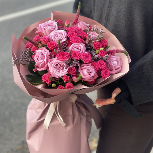Букет "Малиновый вечер" из кустовых малиновых роз, вероники, лимониума и роз Меритим