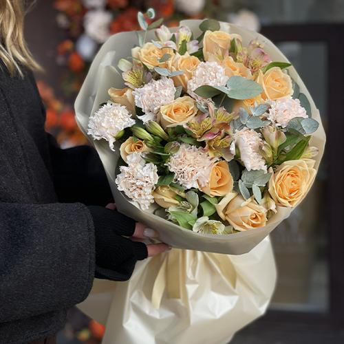 Букет "Пломбирный" из роз Аваланж, диантусов, альстромерий и эвкалипта
